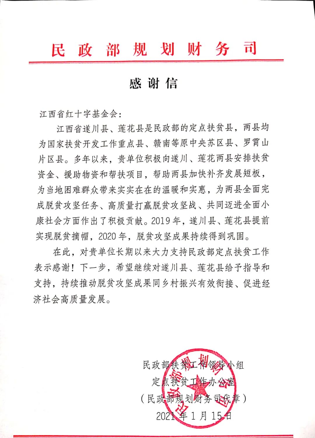 近日,江西省红十字基金会接到民政部寄来的感谢信,感谢基金会对民政部定点扶贫工作的长期支持!