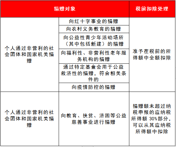 2.个人通过向红十字事业,农村义务教育,公益性青少年活动场所,福利性、非营利性老年服务机构,特定基金会用于公益救济性,疫情防控捐赠准予在税前的所得额中全额扣除。